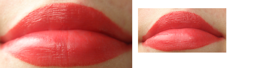 Die Farbe ist ein intensives, deckendes und mattes rot. Sie fühlt sich auf den Lippen geschmeidig an und trocknet die Lippen nicht aus.